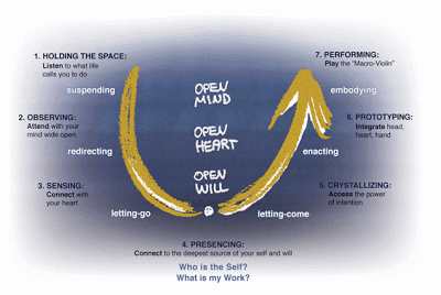 To apply a contemporary framing to Crossing the Threshold, we can draw upon MIT’s leadership specialist Otto Scharmer and his Theory U, which draws from ancient wisdom tradition.  We have to journey down the U by letting-go and opening-up our mind, opening-up our heart, and opening-up our will, so as to connect to Source at the bottom of the U. From this place of inner coherence and connection, we can start to engage in right thought, right relation and right action. A new, richer perception unfolds, and our orientation of self-other-world shifts.
