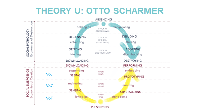 The leadership specialist Otto Scharmer speaks of ‘letting go’ as the primary movement into gaining deeper presence and awareness, so as to see beyond ingrained habitual patterns of though and action. He identifies three inner voices that prevent us from gaining presence. These voices create resistance within us: the voice of judgement, the voice of cynicism, the voice of fear.