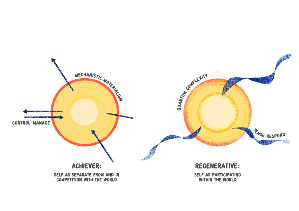 While sustainable business has greatly helped identify and reduce the negative social and environmental impacts of the organization, it does not necessarily involve a mindset shift from mechanistic into living-systems (the way nature works). In fact, the majority of sustainability initiatives I’ve come across over the last two decades often unwittingly compound the mechanistic mindset that created the problems in the first place. Measuring and reducing one impact over-here can have unintended negative consequences over-there, while the underlying mechanistic mind-set that corrupts life itself is left largely unchecked. For sure, sustainable business is better than conventional business, but it’s not necessarily the same as regenerative business, which involves a living-systems mindset that seeks attunement with nature’s rhythms and ways. In my latest book Leading by Nature, I explore this necessary shift from the 400 year-old worldview of Mechanistic Materialism and emerging worldview of Quantum Complexity, and how this activates living-systems leadership and organizational development. (see Leading by Nature).