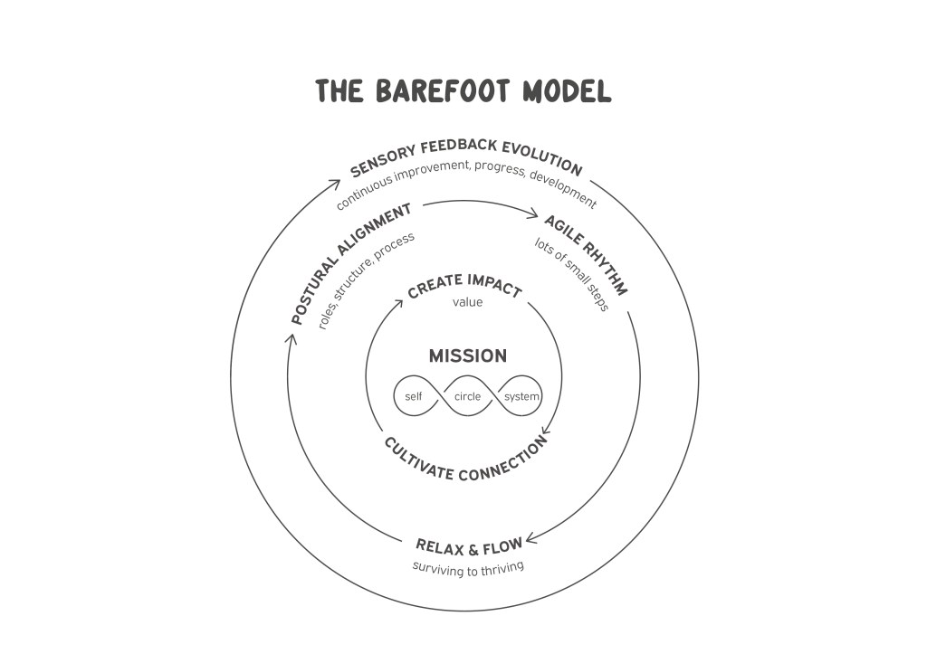 For VivoBarefoot, the framework for regenerative thinking (which it calls ‘The Vivo Way’) links closely to its own advice on effectively wearing its shoes. It consists of upright posture (clear and robust governance), taking little steps (failing fast, remaining agile), relaxing and falling into rhythm (embedding regenerative culture through day-to-day work) and taking on sensory feedback (assessing for present and future opportunities and challenges, quickly correcting course).