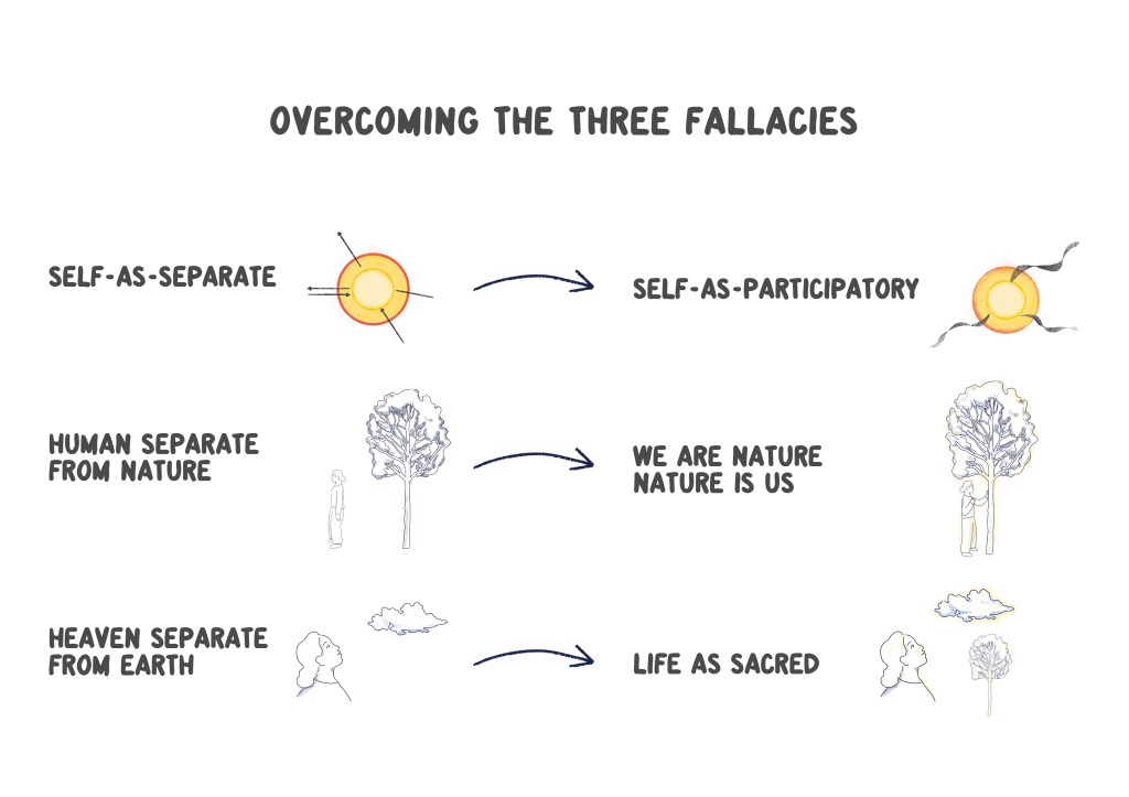 This quantum-complexity metacrisis perspective includes panpsychic, animistic and panentheistic flavours, where the human and more-than-human world is perceived as sacred and ensouled, a perspective that lies at the heart of all ancient traditions the world-over. While acknowledging the varying differentiations across diverse beliefs, traditions and creeds, what’s primary here is an overcoming of the illusion of separation, moving us beyond the dualisms of mind-matter, human-nature, inner-outer, and therefore overcoming The Three Fallacies we mentioned earlier.
