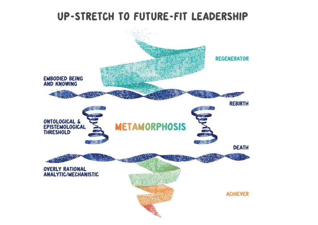This ‘up-stretch’ is when we jump-up a stage in our meaning-making by expanding our consciousness to embrace today’s challenges with a different quality of consciousness than which created them in the first place. This is a move out of the ‘comfort zone’ of MM’s habituated lens of separateness, through the ‘fear zone’ of rising dissonance into the ‘learning zone’ of a new way of experiencing life. It’s a death-rebirth threshold inside our own selves and our collective systems, and requires real leadership and courage to move into the unknown amid volatility and uncertainty.