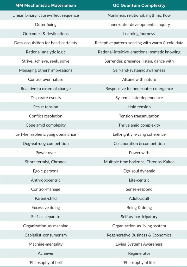 The QC worldview is a profound shift from the MM worldview, and doesn’t happen overnight. This shift is a significant death-rebirth process in our own selves and in our collective methods of education, socio-economics, leadership and governance. Yet, it’s also a transcend-and-include (r)evolution that does not turn its back on all we’ve learnt during the last few centuries of MM. The ambition, self-agency, technological prowess, identity ethics, and scientific innovation evolved through modernity/postmodernity is an important part of our learning journey and lineage. Yet, in moving into QC we bring forth a deeper being-and-knowing and activate ancient wisdom inherent in us long before contemporary notions of Global North, South, East and West. Put simply, QC draws upon modernity’s MM and premodern ways, while working with the latest scientific findings and empirical evidence available to us. Above all, its in-tune with how nature works.
